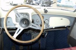 Le grand volant cerclé bois se tourne somme toute assez facilement. Rappelons que la direction à crémaillère n’est pas assistée. Le levier de la commande de boîte, situé à la planche de bord déconcerte au départ mais les trois vitesses se passent à merveille. Malgré son âge respectable l’auto s’avère véloce. Certes ce n’est pas une GTI mais on peut se maintenir aisément dans la circulation.