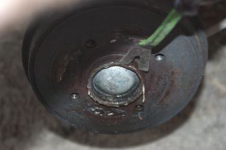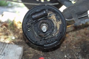 De parts et d'autres, les perçages laissent passer des boulons qui se vissent en lieu et place des boulons de roues d'origine. Ils rendent la plaque de fer solidaire du tambour.Le tambour est déposé, on accede au mécanisme : mâchoires, cylindre de roue...