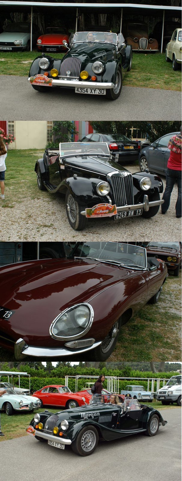 Parmi ces historiques, il fallait remarquer une très belle Jaguar type E "roadster des années 60 (Série 1 ). Cette voiture aux lignes élancées soulignées par le long capot avant et digne de très belles performances ( 150 mph soit environ 240 km/H ) a participé au mythe Jaguar symbolisant les Swinging Sixties. Nonobstant l'esthétique très particulière, la belle avouait une modernité pour son époque issue des meilleures voitures de course : Quatre roues indépendantes, une suspension arrière dotée de quatre amortisseurs, quatre freins à disques... De plus une caisse autoporteuse monocoque avec à l'avant un faux châssis en tubes carrés "Reynolds".