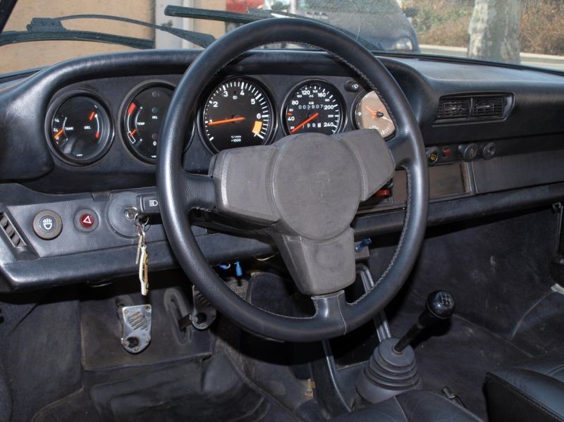 L'habitacle ne renie pas lui aussi ses origines allemande. Pas de superflu ! l'équipement de la SC est réduit au minimum. Reste les options très nombreuses : pack électrique, lave phares, rétroviseurs chauffants à réglages électriques.. Le tableau de bord à cinq cadrans ne change pas, et demeure typiquement 911. On y trouve toujours de gauche à droite la jauge d'essence, la température d'huile et pression d'huile, le compte tours en position centrale (zone rouge à 6300 tr/mn, coupure à 6800 tr/mn), le compteur de vitesse gradué jusqu'à 250 km/H et enfin la montre.