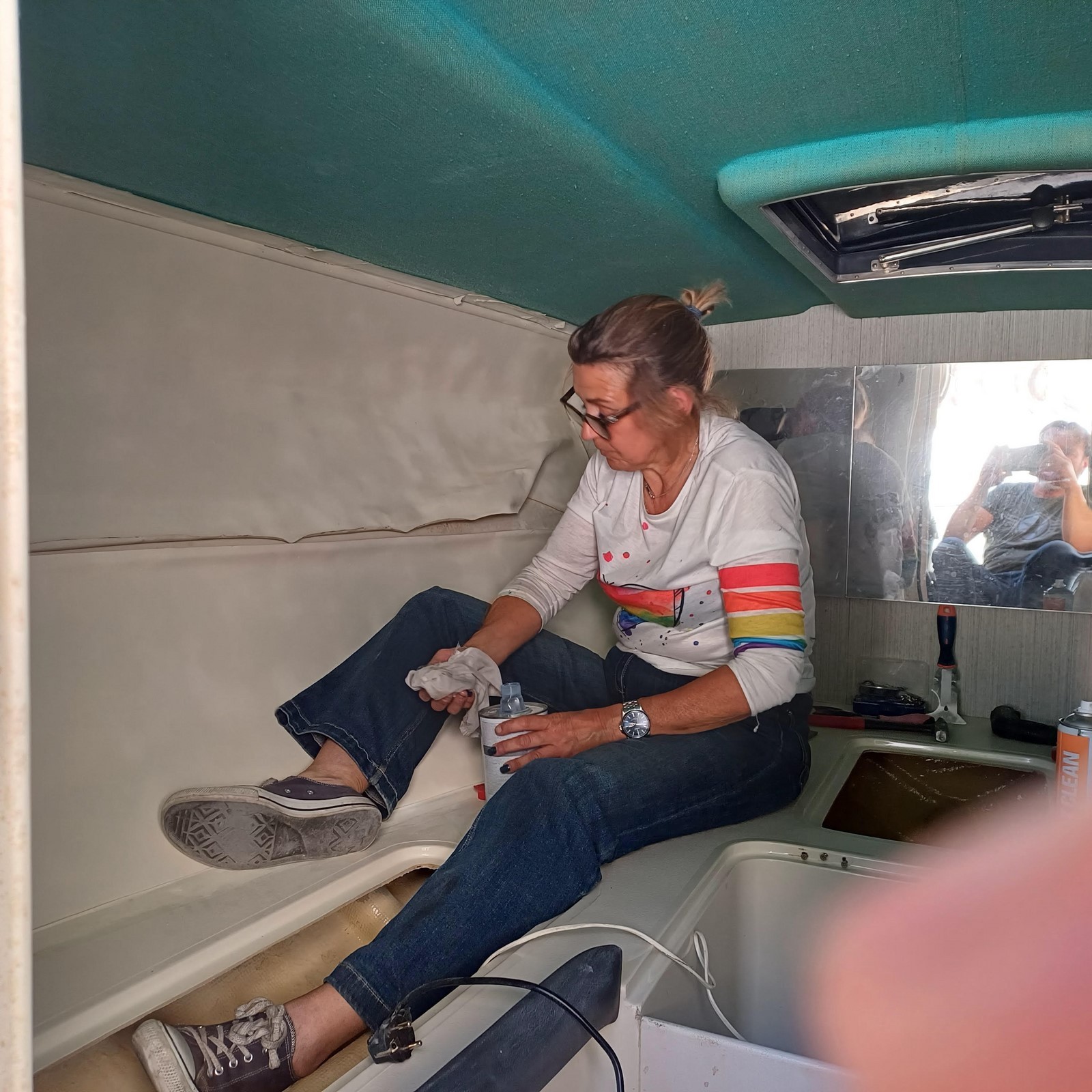 Il faut signaler ce talent que possède Patricia. Si elle maitrise parfaitement ce qui touche une auto elle rénove avec une grande maestria des intérieurs de cabine de bateau. C'est ainsi que récemment elle s'est lancée avec une grande réussite dans la retauration d'une cabine d'un Riva.